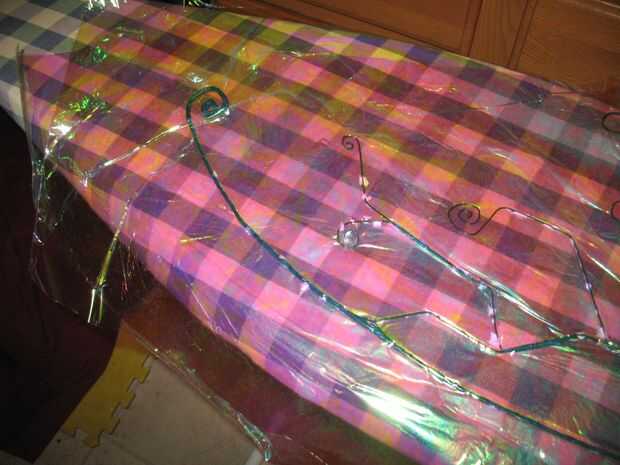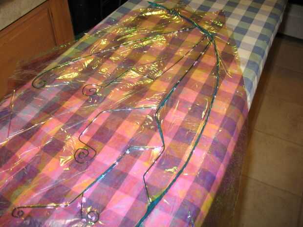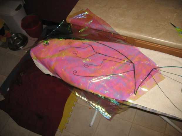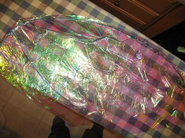Cortar un trozo de celofán lo suficientemente grande como para cubrir el marco de un ala y un poco de extra alrededor de los bordes. Usando como plantilla, corte suficientes piezas adicionales para el frente y la parte posterior de cada ala adicional. ¿Si, como yo, usted tiene sólo dos alas, necesita cuatro pedazos de celofán, ya?