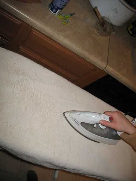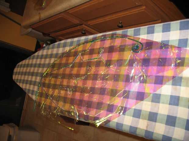Tapa todo el rollo con toalla vieja y de hierro. Si tus alas son muy grandes, que tendrás que hacerlo en el piso con toallas múltiples; mina Monte adecuadamente en la mesa de planchar. Así que, una vez que tienes tu toalla, aplicar a fuego lento, moviendo constantemente (porque utilizamos un adhesivo pegajoso, no necesitan preocuparse tanto sobre la capa superior de celofán desplazamiento). Mi hierro está en '1' para sintético. Esto no es tan rápido como otros métodos que le dirá a hierro el celofán directamente - esto es una idea terrible. No importa cómo bajo hierro se encuentra, casi inevitablemente significa ruina. Utilice sólo una toalla, confía en mí.