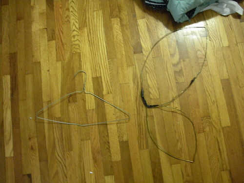 Empezar por Desenroscar la Unión. Entonces el alicate para doblar ese lechón en forma. He conseguido poner la esquina de la percha en la esquina del ala debe ser. Donde unieron las partes, usé cinta aislante para mantener en su lugar. Una crafter más sofisticado siéntete libre unir el cable de una manera que es plausible. La cinta aislante era un pelín difícil de cubrir con ganchillo, así que cualquier manera que usted podría presentar para hacer las uniones más suave un poco sería genial.