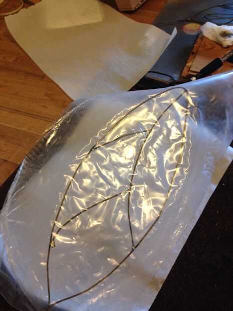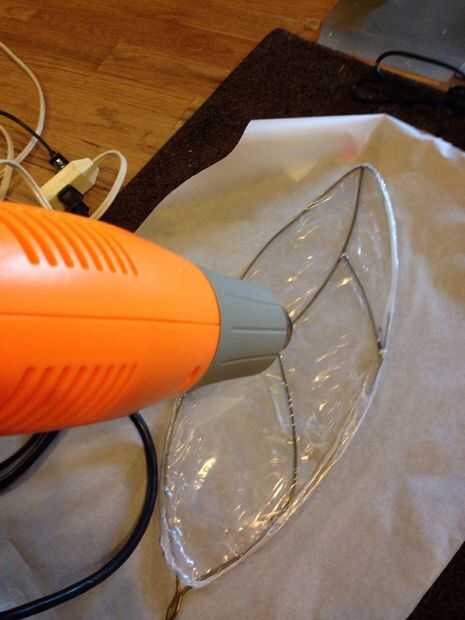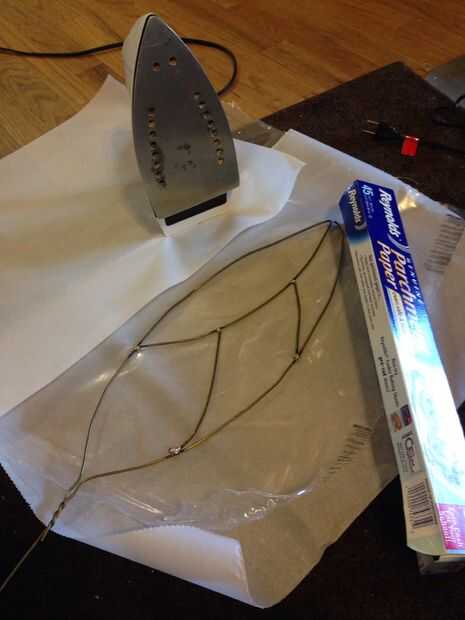 Cortar una lámina de plástico para cada sección del ala, suficiente para plegar como un taco. Emparedado de la estructura del ala y el plástico entre dos hojas de papel de horno. Luego con un conjunto de plancha de ropa a alta o algodón, hierro del ala a partir de los bordes y luego hacia el centro. Mantener el hierro móvil y revise para ver si el plástico se está fundiendo juntos.