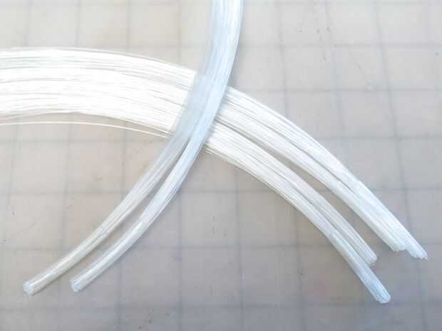Luego tome una longitud de claro. 25" calor del encogimiento del tubo (cerca de 1.5" de largo) y deslícelo sobre un extremo de cada haz de fibras. Utilice su pistola de aire caliente para la tubería alrededor de las fibras del encogimiento y presione con los dedos.