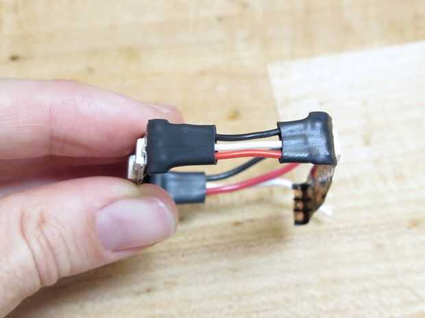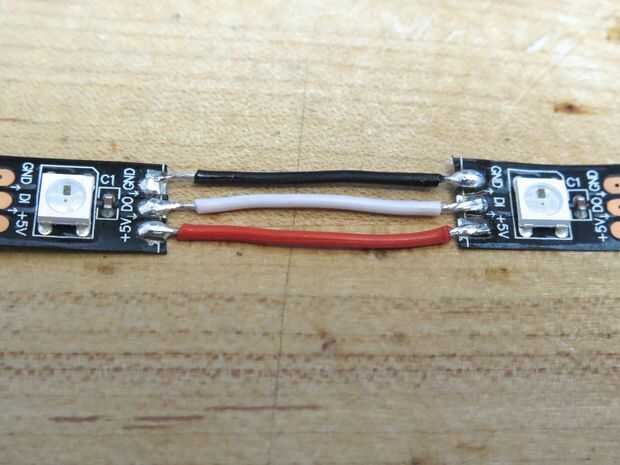 Para conectar tu LED a su conector de la batería de microcontrolador y conmutador, primero se corta la tira de LED en dos secciones de 3 LEDs. Mida su caja y una longitud de cable entre estas dos secciones que permite los LEDs enrollamiento alrededor y dentro de la caja con un pequeño espacio entre las tiras de LED y las paredes de la caja de la soldadura. Otra longitud corta del alambre en el extremo de la entrada de la franja de soldadura y tapa todas estas juntas con la soldadura caliente pegamento y encogimiento.