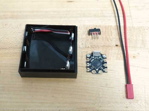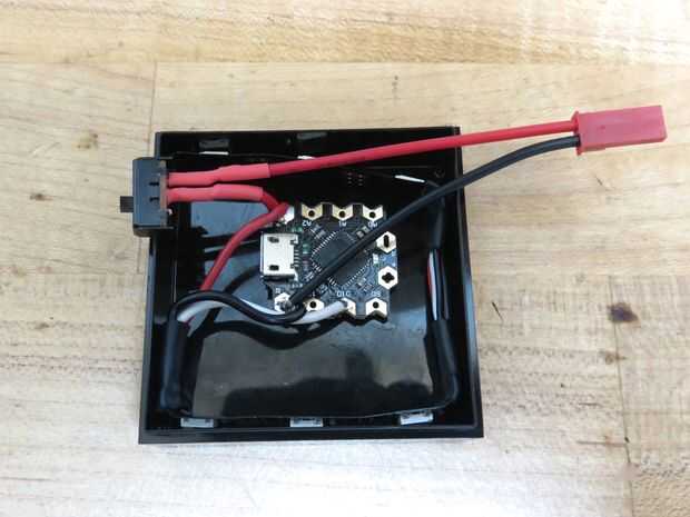 Entonces alambre su interruptor, tira de LED y regulador de la batería a tu microcontrolador como se muestra arriba, haciendo los componentes la distancia adecuada para caber dentro de la caja. Sus empalmes de la soldadura del encogimiento del calor donde sea posible para protegerlos.