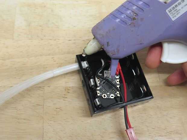 Encuentre la mejor posición para el paquete sobre el LED para que todas las fibras están transmitiendo luz y encender las luces. luego apagar las luces y utilizar tu pistola de pegamento caliente para fijar el paquete de la fibra en su lugar contra el LED dentro de la caja.