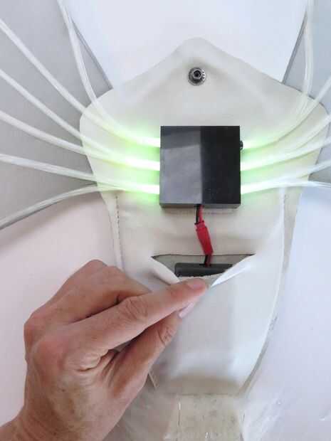 Para fijar el módulo de electrónica a las alas, pegar el otro lado de dos tiras de velcro a la caja negra por lo que puede pegar al velcro ya cosida sobre el cuero.