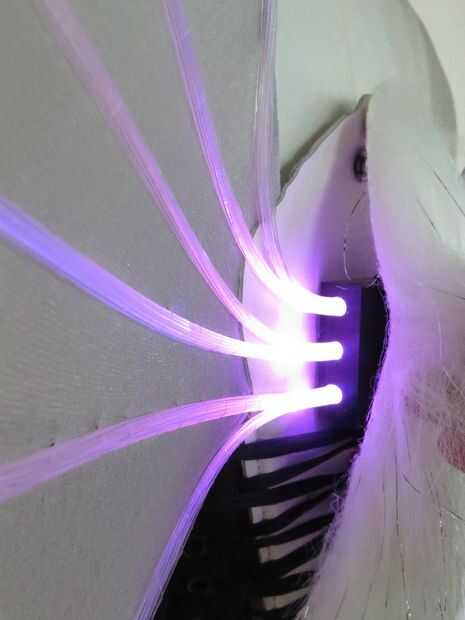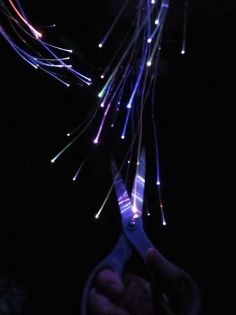 Encender las luces en las alas, apagar las luces en la habitación y utilizar tijeras para recortar las fibras de colgar de manera que se ve bien a usted.
