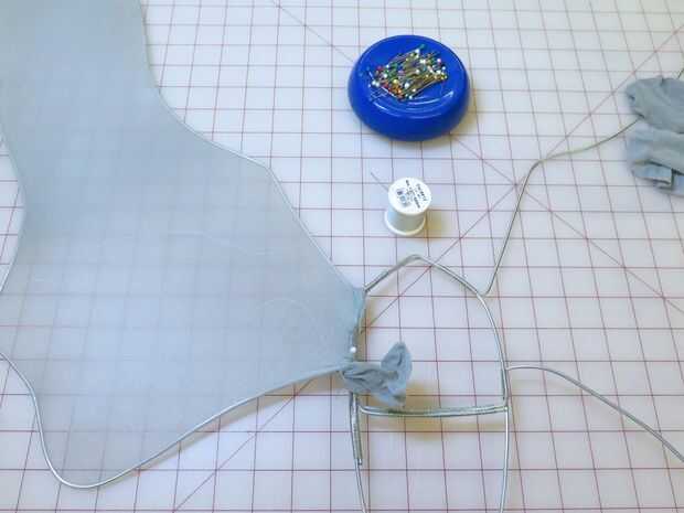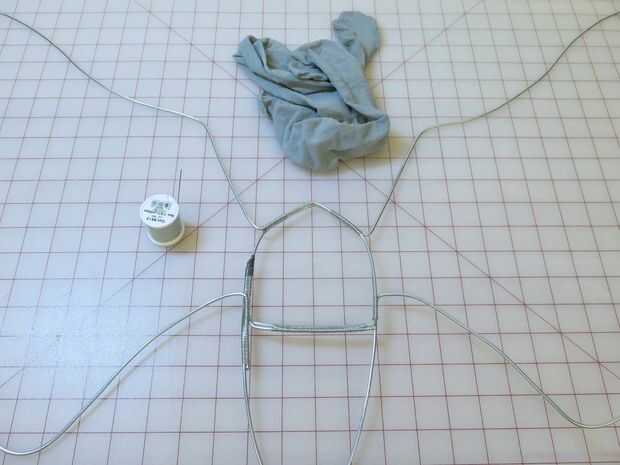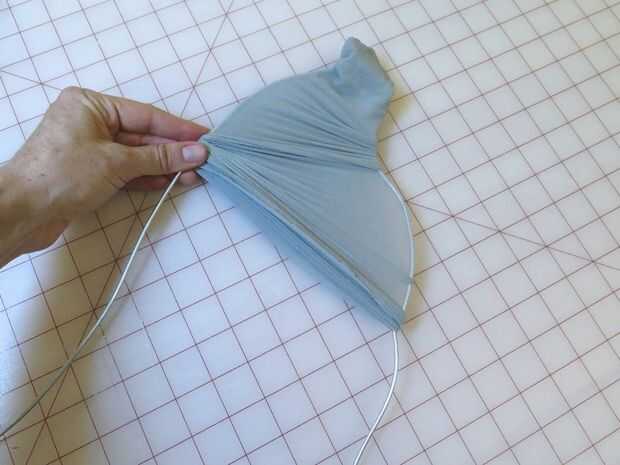 Cuando tienes las medias estiradas como uniformemente como sea posible sobre el ala entero, tome el extremo y ti alrededor del marco de la torcedura en la base. luego tomar el hilo y aguja y virar firmemente hacia abajo el extremo torcido de apretado sobre sí mismo. Corte cualquier exceso tejido más allá de la línea de costura y lo mismo en el otro lado.
