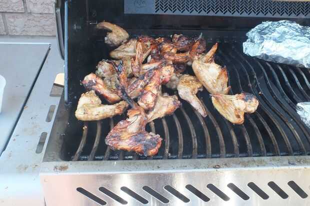 Coloca sobre una parrilla caliente y cada 5 min o hasta que la carne se tira aparte fácilmente en la articulación. Aprox. 1/2 hr.