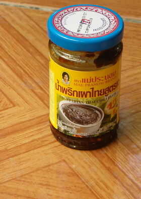 << 'Nam prik pao' pasta de Chile está disponible para la venta fuera de Tailandia, como la marca en la foto, pero puede ser difícil de encontrar.
