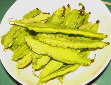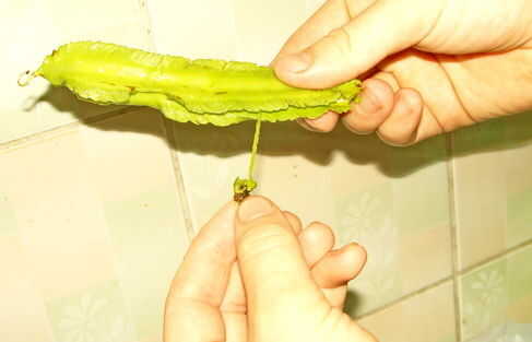 Si usas alas frijoles, asegúrese de quitar los extremos y tire de las cuerdas si tus granos son maduros (ver foto).
