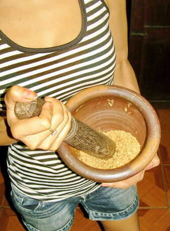 En primer lugar, triturar los cacahuetes a un polvo áspero. Esto se logra mejor usando un mortero y una maja, pero podría darles un pulso rápido o esconderlos en un plegado sobre papel de cera y golpear con su zapato.