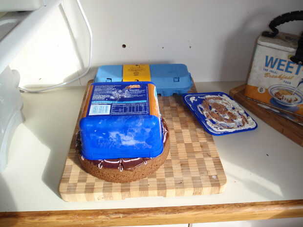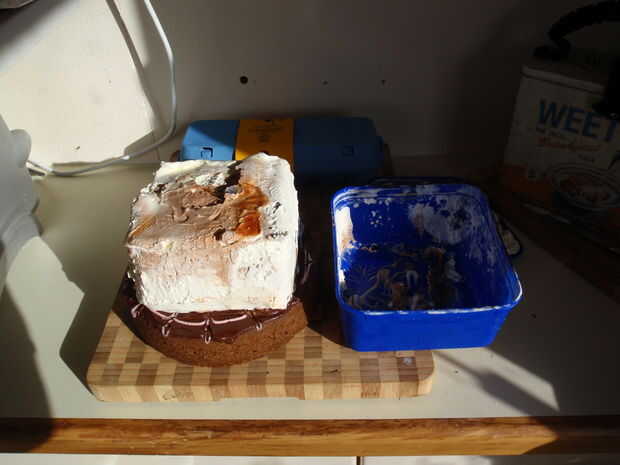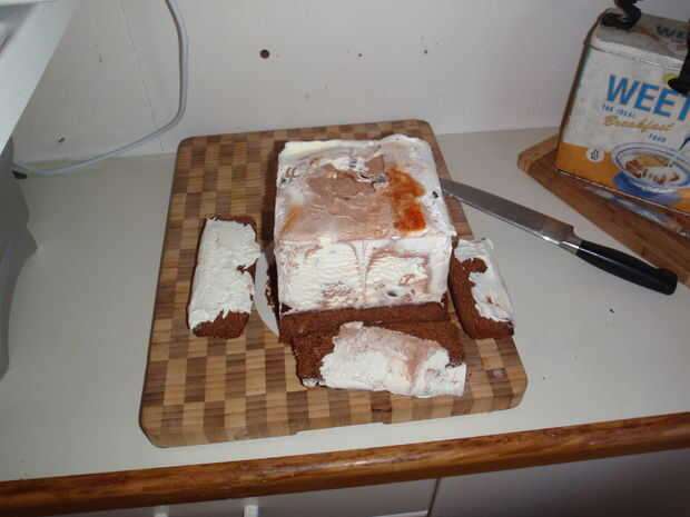 A continuación, recortar los lados si es necesario y meter todo en el congelador mientras prepara el merengue. Si sólo usas un bizcocho, puede pagar dejarlo congelar durante unas horas endurecer encima de. Pero puedes hacer brownies o algo más duro, así y en ese caso mantener el tiempo de congelación menos de una hora, de lo contrario nadie podrá morder a través del bloque de hielo de brownie.