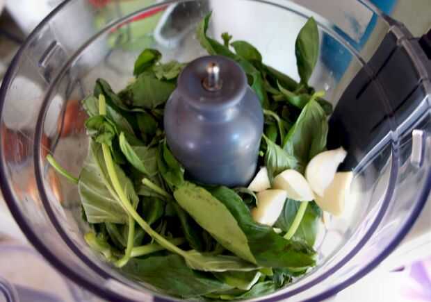 este año, hemos tenido una notable cosecha de albahaca. Nuestros doce pequeños tallos rindieron más de diez tazas llenas de hojas de lechuga albahaca. Basilio tanto conduce a un cierto destino en cocina de un entusiasta de la comida: pesto.En combina