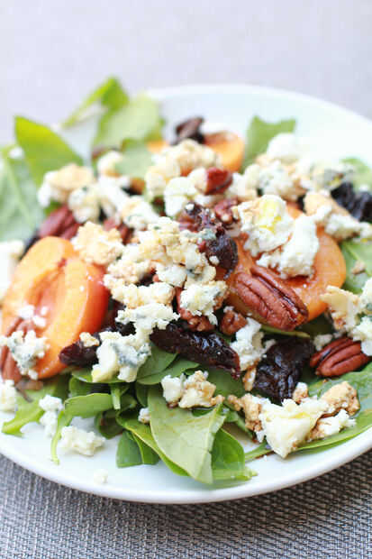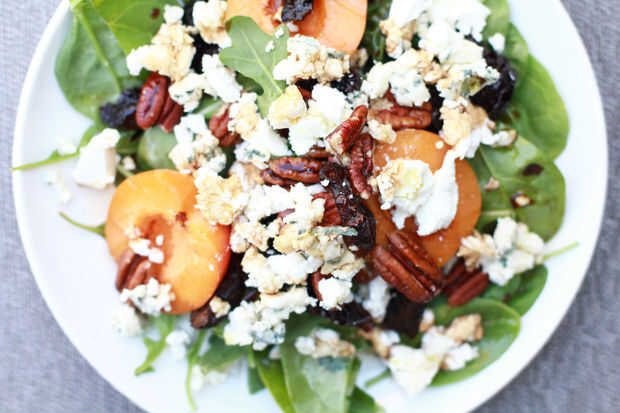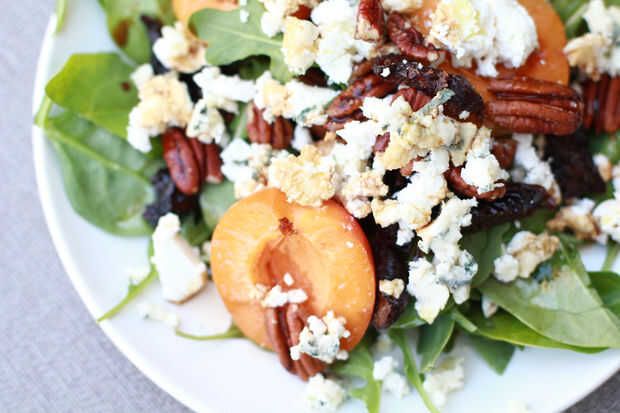 1. organizar los verdes en un plato. Colocar los albaricoques y las ciruelas en los greens. Espolvorear el queso y las nueces picadas sobre la fruta. Rociar con aceite de oliva y balsámico. Servir.