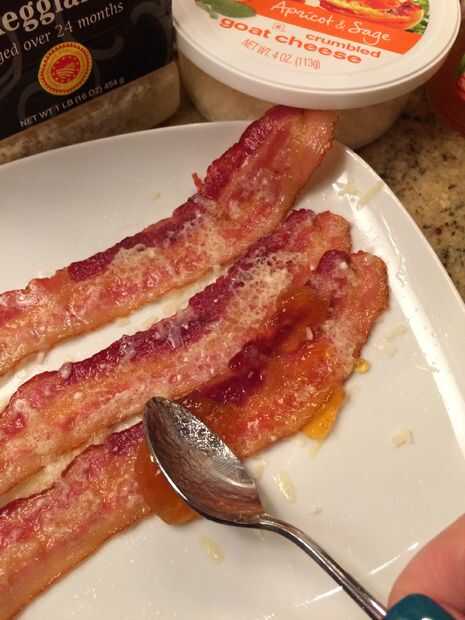 Hará cualquier mermelada de albaricoque. MMM. Esto evitará que el queso de cabra perder pegado al tocino cuando se ruede para arriba.