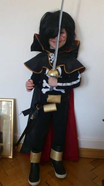 Arriba: compré un suéter negro de cuello de polo. Para el cráneo, cabeza, señalo uno de Albator en feutrine blanco, cortarlo y mano lo cosa.