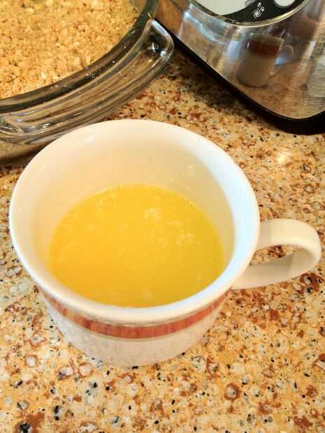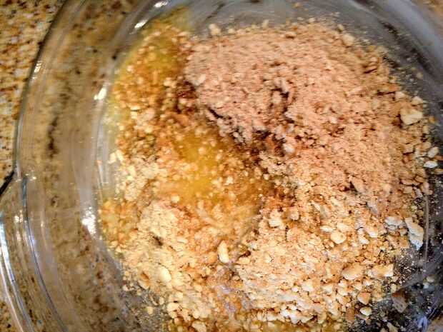 En una tartera (utilicé una tartera de vidrio), vierta la mantequilla derretida y añadir el polvo de galleta. Mezclar los dos ingredientes con la mano para formar una masa, se trata de la corteza de la empanada.  Presione la masa con los dedos para cubrir el fondo de la tartera, luego añadir la mezcla que guardaste (paso 2)