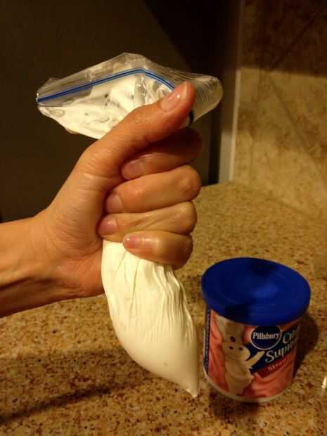Cortar un extremo de la bolsa, hacer un poco de todo para que la crema puede venir hacia fuera en una sola secuencia para dibujar el cuadro con ella. Esto va a ser su hiela el lápiz.