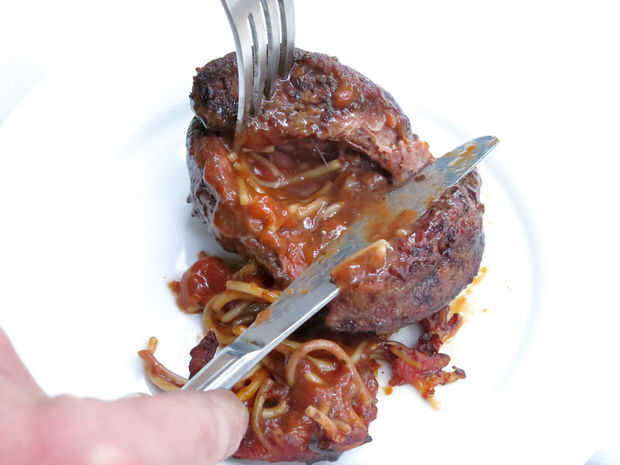 Filete en los espaguetis afuera, en el interior. ¿Lo que no es gusta? OK, tal vez encuentre lo que regurgita goteo espagueti rojo a través de la placa un poco desagradable, pero creo que es muy entrañable. Y sí, el hecho de que puede que tenga que sacar unas puntadas antes de comer podría dar pausa para pensar, pero creo que te hace apreciar el esfuerzo del chef más.