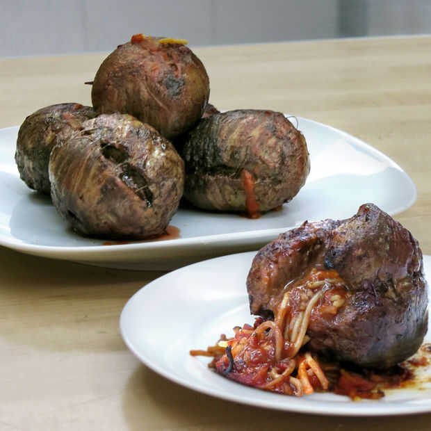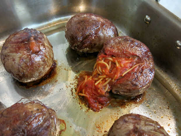 Mi objetivo era crear un plato que se vería un poco inexplicable, pero que saldría para ser comestible, delicioso y aún familiar. Se me ocurrió con el plan para producir una esfera de carne que parece que han crecido como un solo órgano en vez de pegadas de carne como albóndigas normales. Tratando de pensar en algo para llenar el centro de la esfera, tuve la idea de hacer el plato entero en una especie de adentro hacia fuera espagueti y albóndigas.