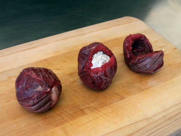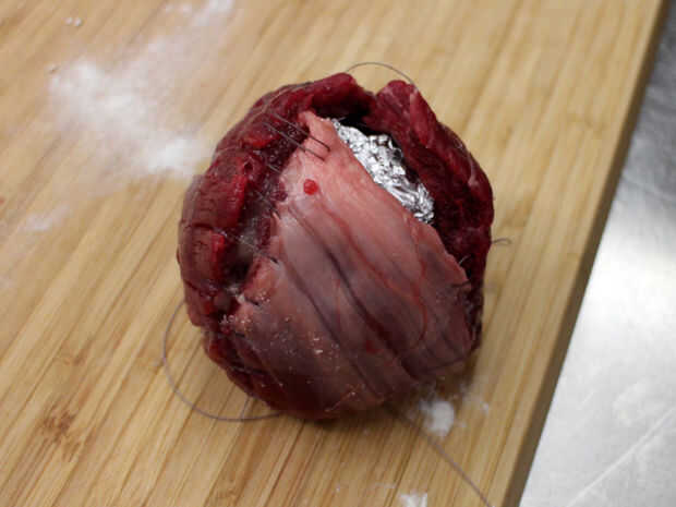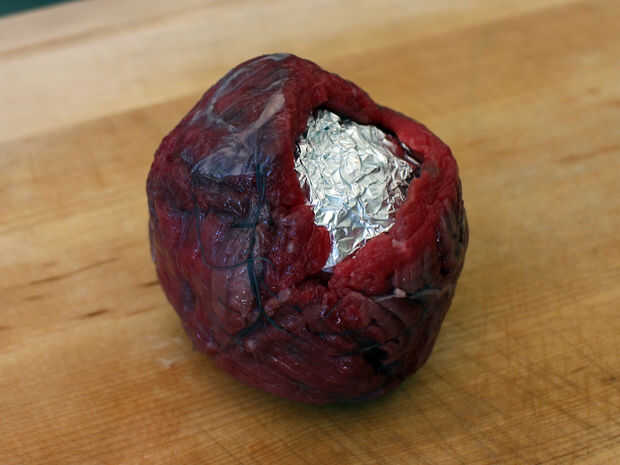 Cosas cada bola con una esfera rugosa de amontonados encima de papel de aluminio para ayudarles a mantener su forma mientras que el pegamento de carne trabaja su magia. Hacer un poco de la mezcla de agua y pegamento de la carne, y luego extendido a lo largo de todas las costuras para hacer absolutamente seguro que el sello.
