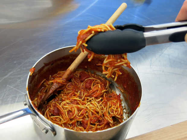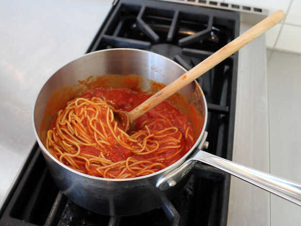Mientras que usted está dejando las bolas chill, pueden preparar los espaguetis de relleno. Por supuesto puede rellenar las albóndigas con cualquier receta de pasta que desee, pero espaguetis boloñesa es una buena manera de ir.