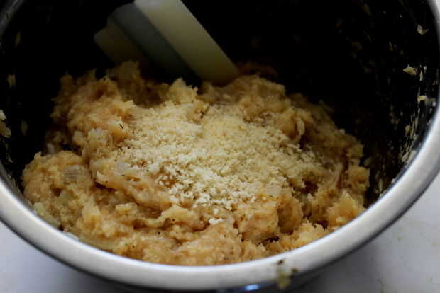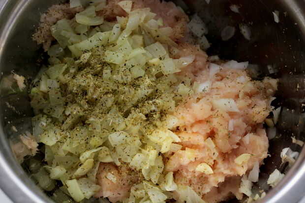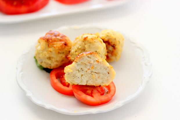 Las indicaciones de la receta: PRECALIENTA el horno a 350 grados. Poner cucharadas de aceite de oliva en una placa para horno y reservar. En un procesador de alimentos lugar de pechuga de pollo y el pulso hasta que parece una pasta, colocar en un bol y reservar. Baja a fuego medio, añadir una cucharada de aceite de oliva a la sartén y dejar que caliente; cortar la media cebolla y el ajo y añadir el aceite y saltear hasta que la cebolla esté translúcida. Una vez que la cebolla y el ajo se haya enfriado agregar a la taza; Añadir sal y especias al bol y mezclar. Añadir huevo y mezclar luego agregar el pan rallado y mezclar. Formar bolitas y colocar en la hoja de la hornada. Coloque en el horno durante 15-20 minutos. Dejar enfriar y servir.