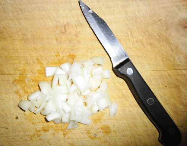 En primer lugar, cortar la cebolla en trozos pequeños. Añadir un chorrito de aceite a una sartén y cocinar las cebollas hasta que estén suaves. No dejes que marrón. Dejar que se enfríen.