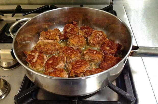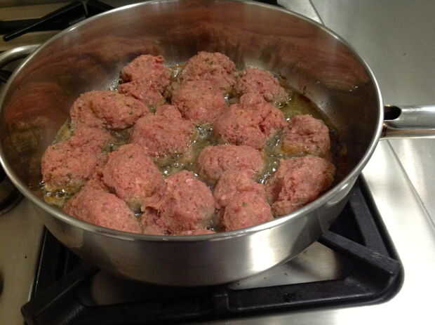 En una sartén grande con aceite de oliva, marrón cada lado de la albóndiga, después reduzca el calor para terminar la carne.