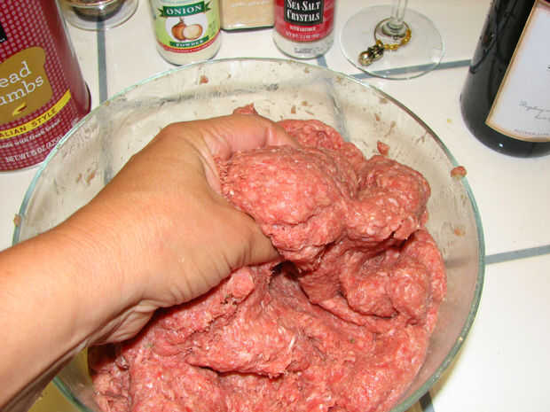 Uso mis manos para mezclar todos los ingredientes. (lavarlos bien primero) Cavar con ambas manos! Mi abuela italiano solía decirme que esto era muy importante. Se debe mezclar con las manos! Sólo aplastar las manos a través de él una y otra vez. Mi abuela me dijo cuando crees que se ve como se mezcla suficiente... mezcla un poco más. Más no puede hacer esto.