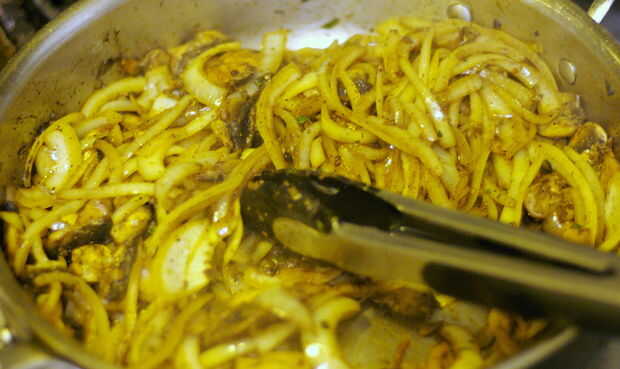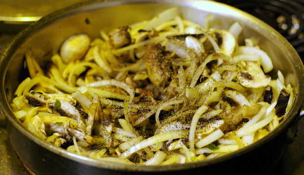 Cortar 2-3 cebollas en razonablemente fino (~1/4 ") medios anillos de espesor y agregar a la olla. Cortar un puñado grande (o dos) de hongos y añadirlos también. Espolvorear con sal y pimienta y tal vez un poco de polvo de Chile ancho si eres un fan.