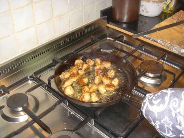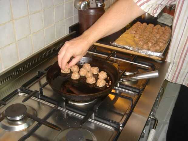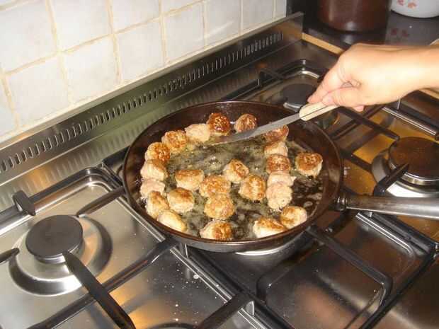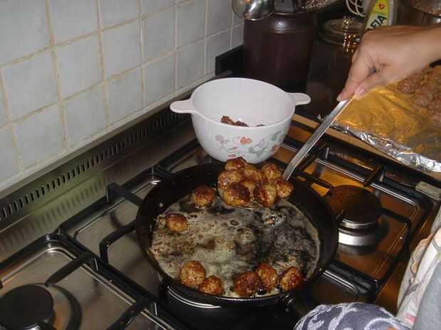 Llene la mitad del pan con albóndigas y freírlas por mientras por un lado, hacerlas rodar alrededor un poco con una espátula. Después de un tiempo puede sacudir la bandeja para obtener las albóndigas en movimiento y conseguir redondo y frito por todos lados.