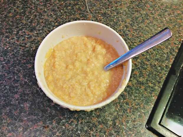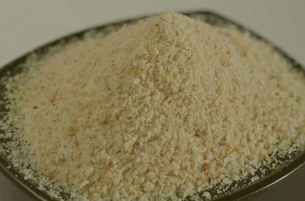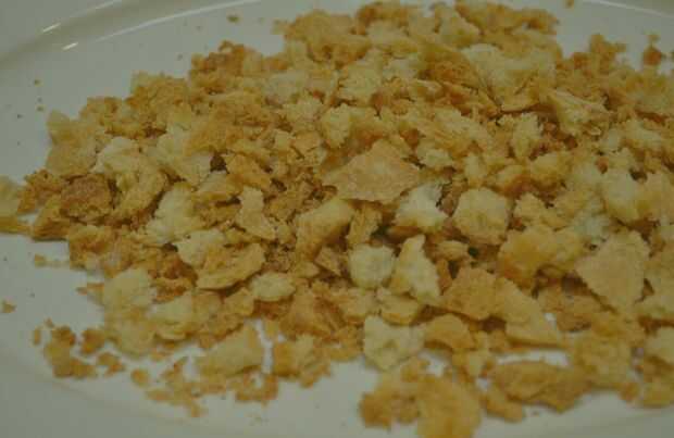 Miga de pan en un bol pequeño, un decilitro o una taza. Añadir 1 decilitro o menos de una taza de agua junto con el pan desmenuzado. Añadir a la taza.