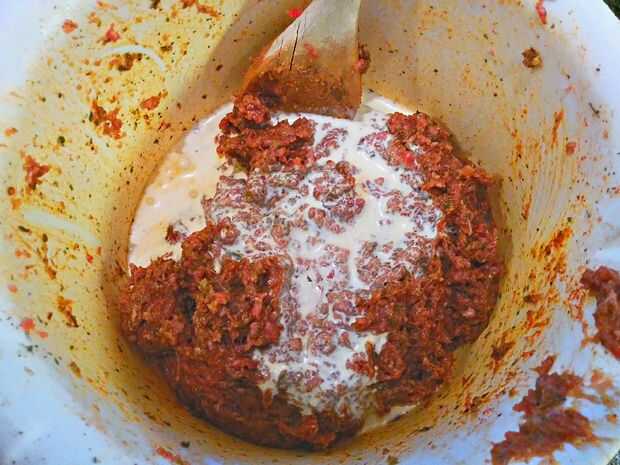 Añadir un medio decilitro de crema doble. tazas de 0,2. Mezclar bien con la carne.