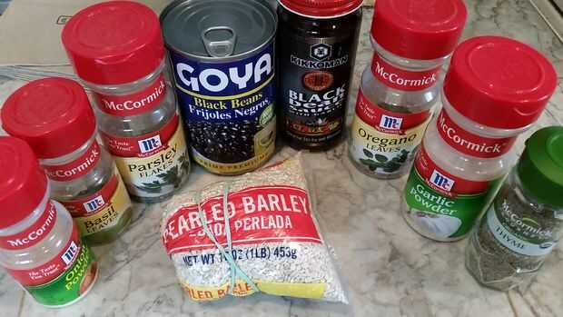 Usted puede jugar con los condimentos y hierbas, que es la combinación que utiliza. Los componentes más importantes son los tres primeros. Los frijoles dan la proteína de albóndigas, el color y la estructura mientras que la cebada da la sustancia de albóndigas y textura. La pasta de frijol negro da las albóndigas sabor umami que falta sin la carne.