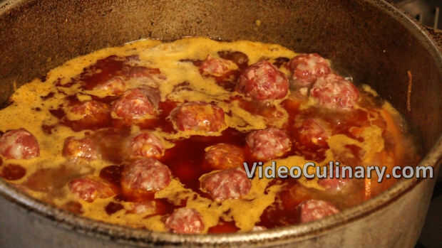 Sacar del frigorífico las albóndigas y agregar a la olla. Llevar a hervir y cocinar a fuego lento a fuego lento.