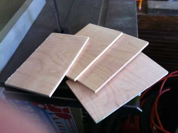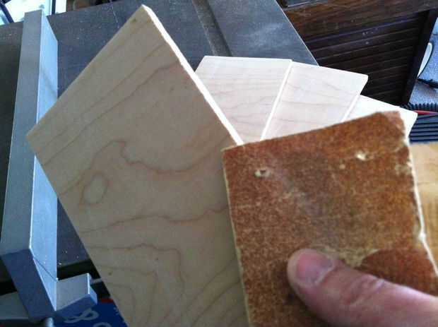 Que cortar la madera en varios 4" por 6" azulejos y lijadas a mano brevemente con lija de grano 80. Las baldosas no tienen que ser exactamente del mismo tamaño, pero se ve mejor si están cercanas.