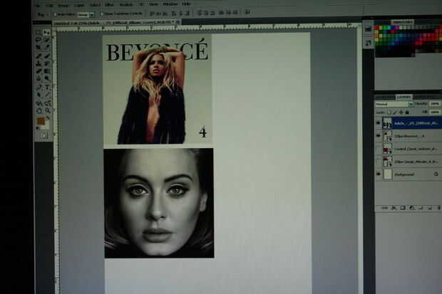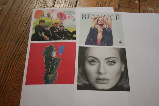 Imágenes de Google de vintage sellos y álbumes musicales y verlas en tu computadora para que estén un poco más pequeños que sus azulejos de cerámicas cuadrado. A continuación, imprímalos.