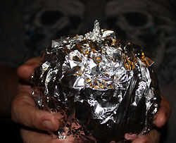 Envolver el globo firmemente con papel de aluminio. 2 capas pueden ser necesarias. He marcado la parte superior del globo pellizcando la hoja recordar qué lado fue para arriba. Coloque en el horno durante 1 hora o hasta que la alcachofa es buena y tierna.