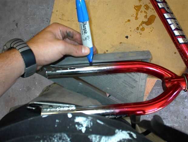 Dibujo una línea en las horquillas facilita alinear más adelante cuando usted soldar nuevamente juntos. Esto es más fácil ver en los pasos posteriores.