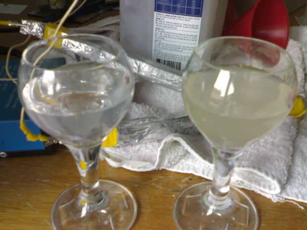 El agua cargada positivo (donde estaba el electrodo negativo) será suavemente.