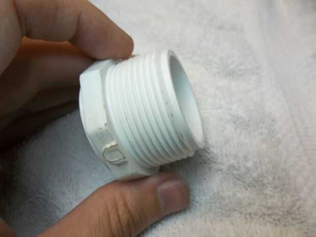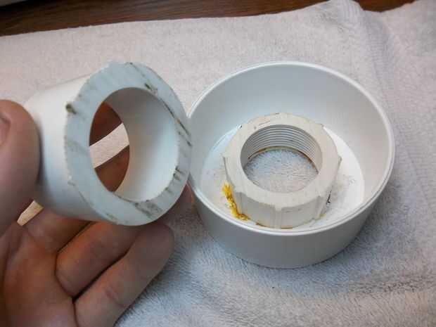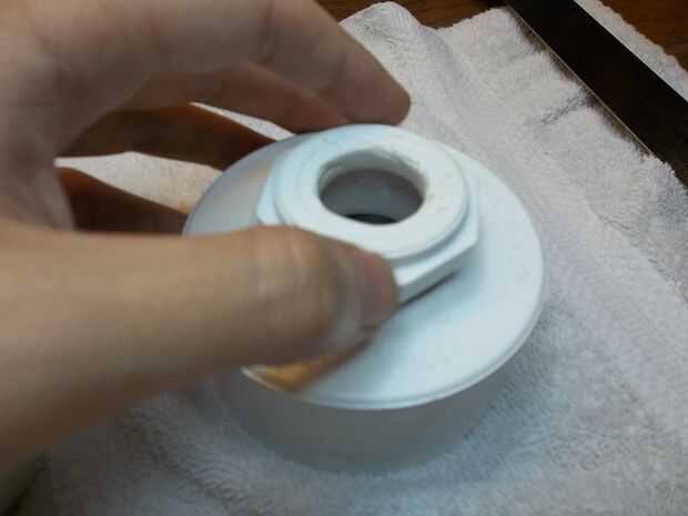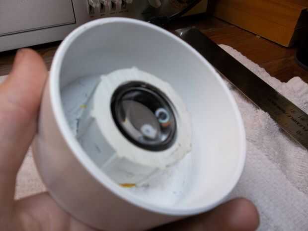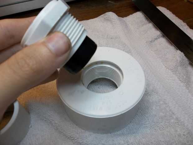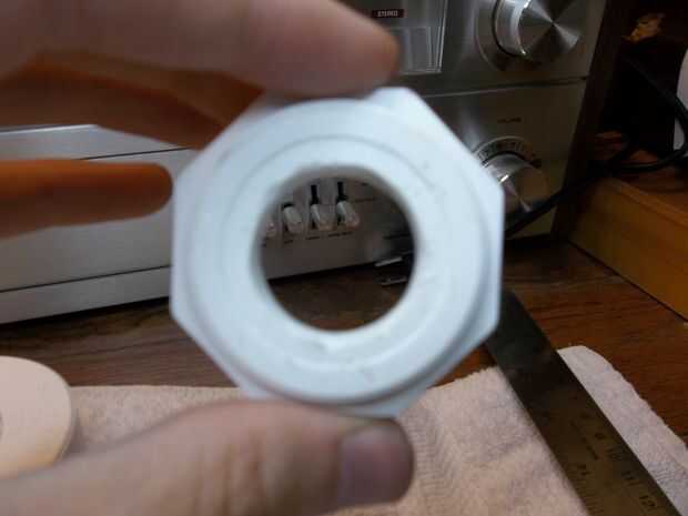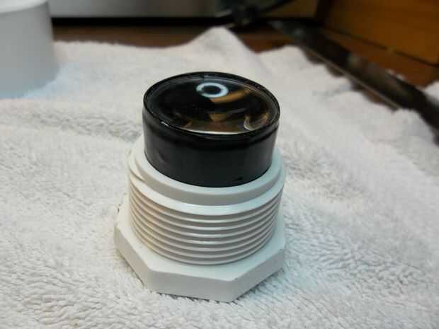 Para hacer el ocular, tengo un tapón de roscado y rosca adaptador que pude ajustar mi ocular a y corte todos los hilos de rosca del adaptador. Tengo mi cap 3" final y corte un agujero en ella con un agujero vio poco. Creo que utilicé un 1 y 5/16". En realidad, el agujero sólo debían ser lo suficientemente grande para enhebrar el enchufe en el adaptador a través de la tapa del extremo. Tomé otro Serrucho y cortar un agujero en el tapón roscado por lo que pude ver a través de la lente. Lijar los bordes del tapón roscado y había grabado juntos mi Asamblea de lente envolviendo cinta aislante alrededor de él. El objetivo fue capaz de sostenerse en su lugar después de envolver más cinta aislante alrededor de él calza perfectamente en el extremo del enchufe.