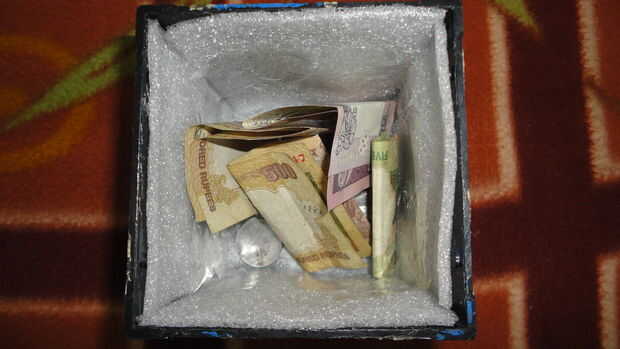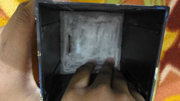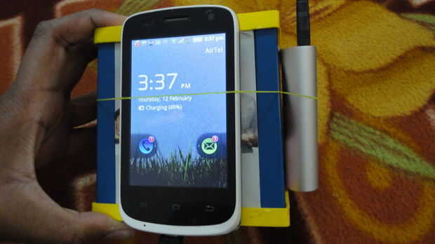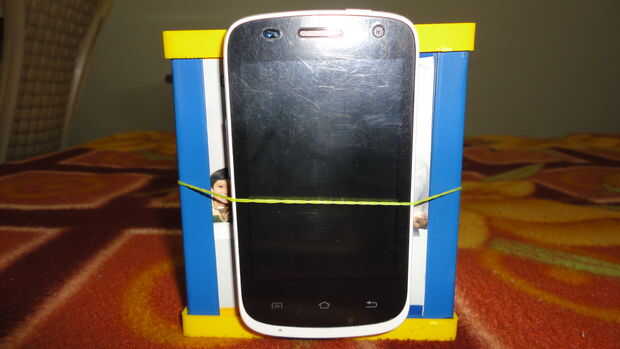 Tome la banda elástica y resbálelo a través de la hucha y poner el teléfono inteligente en él, como se muestra en las imágenes...