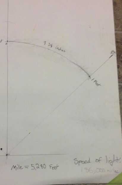 Primero empecé con representación gráfica el concepto sobre el papel. Me enteré de que un pie a 90° en un ángulo de 45° tenía un 9 7/8 de una pulgada de longitud. Así que si x = pies entonces y = x•9 7/8. Pongo esto en una tabla como se ve en la segunda foto. pero esto tiene que igualar al menos 186000 millas por segundo. • Tan 186000 52140 (para convertir los pies a millas) = 9698040000. Ahhh! gran número! x • 9 7/8 = 9698040000.