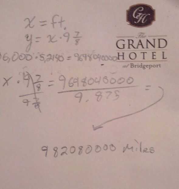 x = 982080000 millas. Esto significa que el palo tiene que ser 982080000 millas de largo. ahora esto es un gran número pero puede reducirse moviendo el palo más rápido en un ángulo recto o incluso un ángulo obtuso. Gracias por leerme. por favor voten por mi!