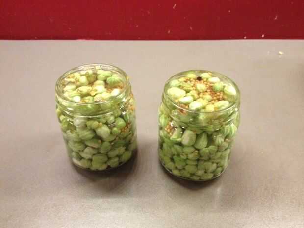 Enjuague las semillas curadas bajo el grifo. No se preocupe: el olor habrá desaparecido rápidamente. Esterilizar los frascos para utilizar hirviéndolos en agua; no olvidar las tapas. Todo debe estar muy limpia; similar a hacer mermelada o salsa picante. Tomar una sartén y hacer una mezcla agridulce de vinagre, azúcar y sus hierbas favoritas como semilla de mostaza, ajo, pimientos etc.. Poner a hervir lento y dejamos cocer durante 10 minutos. Mientras tanto usted puede llenar los recipientes con las semillas. Deje un pequeño espacio en la parte superior para que las semillas se cubrirán totalmente en el agridulce líquido. Vierta la mezcla de vinagre/azúcar/hierba caliente en los tarros para que las semillas estén completamente sumergidas. Ponga la tapa en y dejar para curar durante 4-6 semanas. Las alcaparras será comestibles durante muchos meses siempre tapas y frascos estériles.