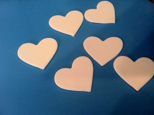 Toma la hoja de fondant blanco que su rodado y cortar un montón de corazones. Tome el pequeño pedazo de fondant amarillo y rasgar un pedazo pequeño de él. La pieza amarilla del rodillo en la placa de pastillaje (fondant) para hacer una forma de pequeño tubo.