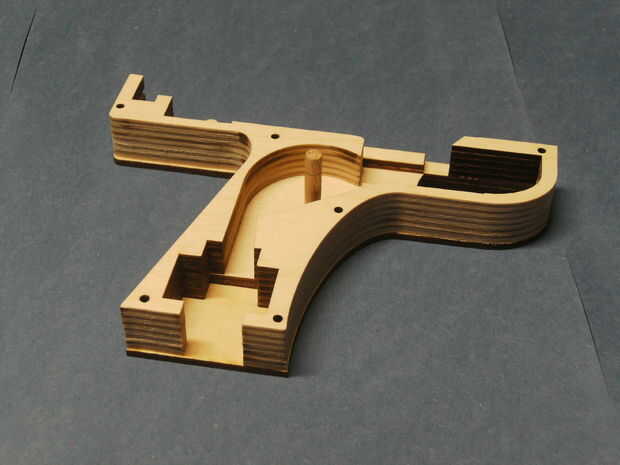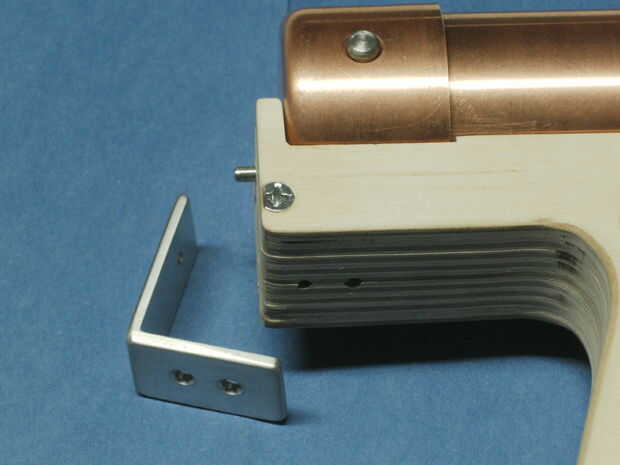 FOTO #7 cortar un 1/2 pulgada largo pedazo de ángulo de aluminio de 1-1/2 pulgadas x 1-1/8 pulgadas x 1/8 de pulgada para asegurar la parte posterior de la cámara de combustible a la empuñadura. Taladrar dos orificios de 1/8 de pulgada a través de la pata de 1-1/8 de pulgada 1/2 pulgadas aparte y adjunto a la empuñadura con tornillos para madera #6 x 1/2 pulgadas. Mide para localizar el agujero para el perno que sobresale por la parte trasera de la estructura de la cámara y grip de combustible y perforar un agujero de 3/32 pulgada en esa ubicación.