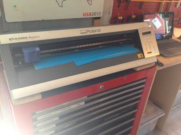 "Ahora que todos los bocetos de estudiante se formatean correctamente, nosotros podemos imprimirlas en el cortador del vinilo. Tenemos que alimentar la hoja de vinilo en la impresora para prepararla. Como se imprime, ver cómo se corta el vinilo." Tomar las predicciones y observaciones. (5 minutos)