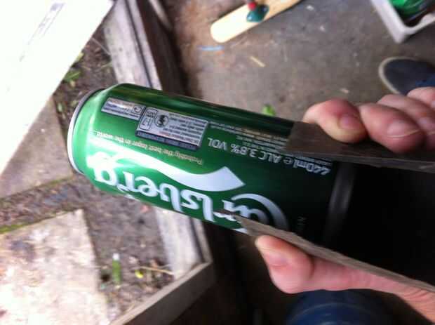 Primero queremos a la arena de la pintura en la parte inferior 2inches o tan de un can, me pareció más fácil hacer esto cuando el puede todavía fue sellado con bebida en como lo fue bajo presión y menos ligeramente arrugamos. Sólo queremos para una poder sin embargo como se trata de la superficie externa. Usé un grado bastante fino de papel de lija 400grit como no quiero dañar la superficie de la poder sí mismo.
